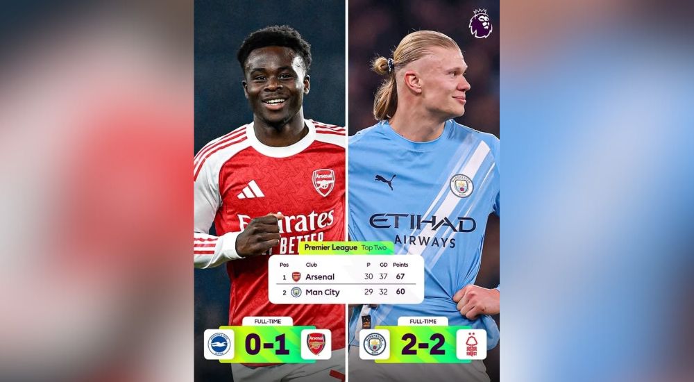 The latest results leave Arsenal seven points clear with 67 points, placing them firmly in control of the race. Manchester City remain on 60 points, though they hold a game in hand that could reduce the deficit.