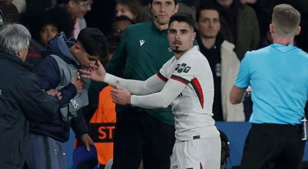 The 26-year-old Portugal international shoved the youngster in stoppage time of Wednesday’s last-16 first leg at Parc des Princes – where Chelsea lost 5-2 – which caused him to fall off a chair.