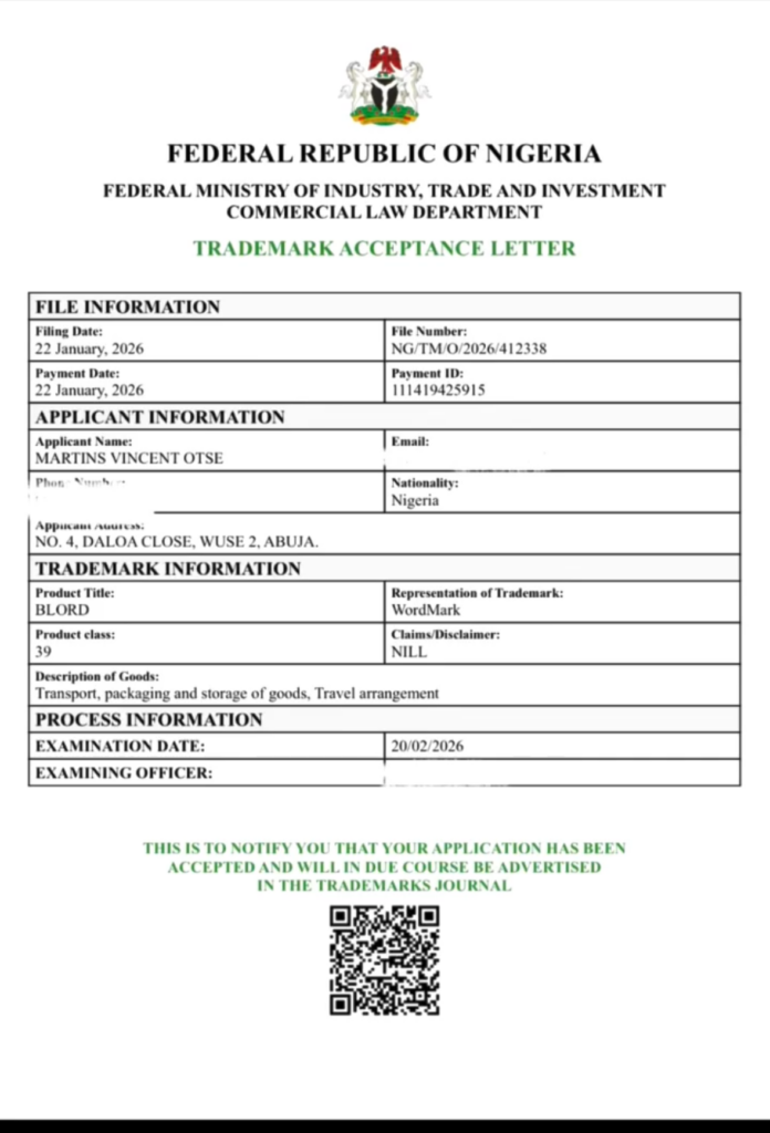 In his video, VDM shared a screenshot of a “Notice of Acceptance” from the Nigerian Trademark Registry to validate his claim. This document indicates that his application for “BLORD” in Class 39 (Transport and Logistics) was formally accepted by the Registrar and slated for publication. Official Trademarks Journal records list VDM’s application (NG/TM/O/2026/412338) as a wordmark.
